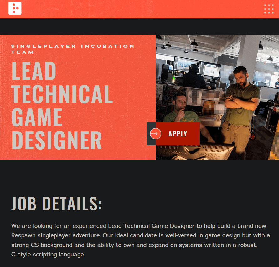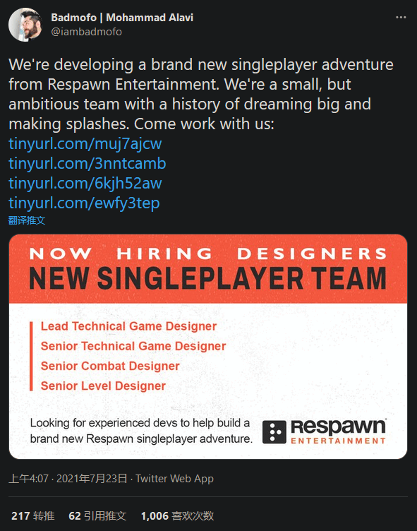 重生工作室创意总监Mohammad Alavi今天(7月23日)在推特上发推,表示工作室正在招募“全新单人游戏团队”职位。