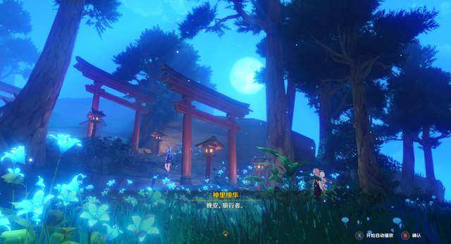 比起“雪鹤之章”神里绫华水中起舞的片段,我更喜欢月下归家的场景。满山轻摇的野花、昏黄的路灯、寒冷的月光,寂静中带着几分祥和。默默伫立的鸟居下,旅行者注视着神里绫华的背影,仿佛时间就此成为永恒。