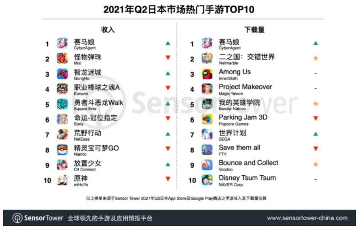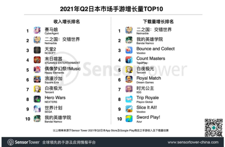 2021年Q2日本手游市场 29款中国手游入围TOP100,一起来看看