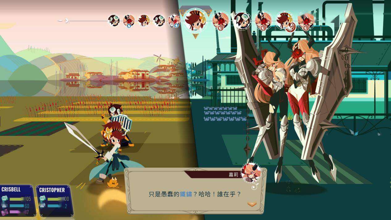 此外,“时间控制”还体现在玩家的技能组合上,主角克莉丝贝尔可以将一名中毒的敌人送到未来,让毒素对他造成大量瞬间伤害,或是用水浇湿金属属性的敌人,让他们在未来得到一个“生锈”的Debuff。