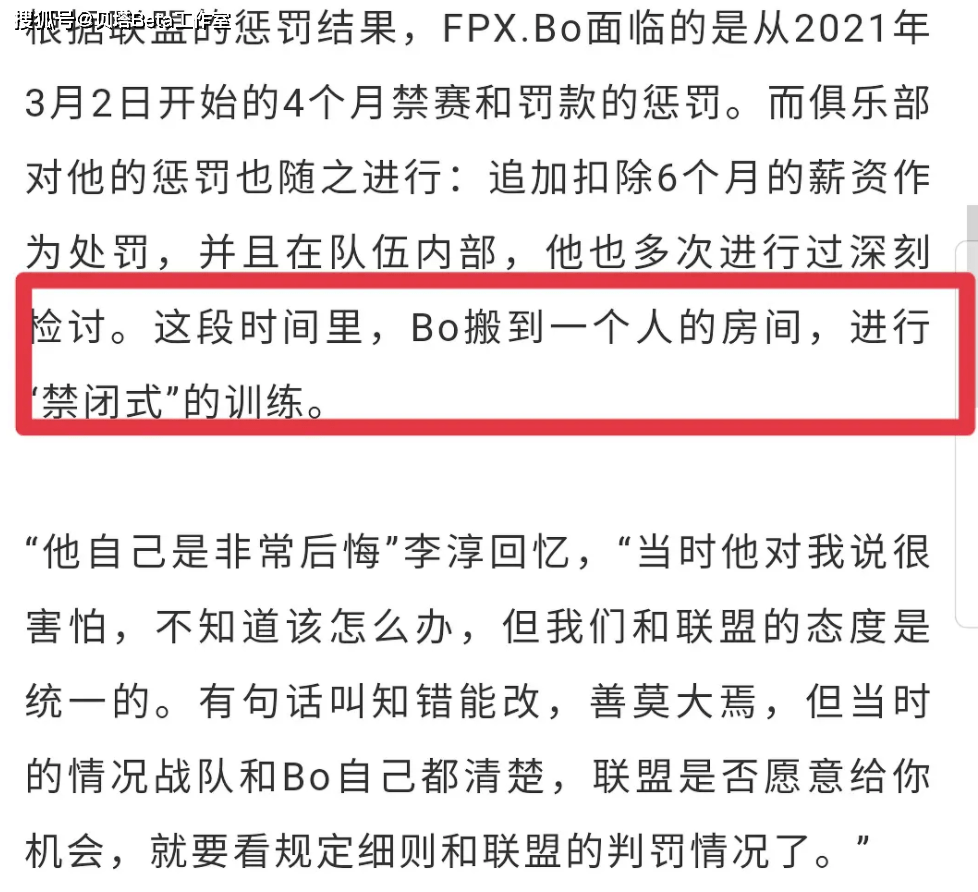 采访内容部分如下,首先是李淳表示Bo在受到官方的处罚之后,就搬到了一个人的房间里面,进行封闭式训练。而且李淳也表示Bo对于自己之前的过错非常后悔,不过FPX老板认为知错能改就行。