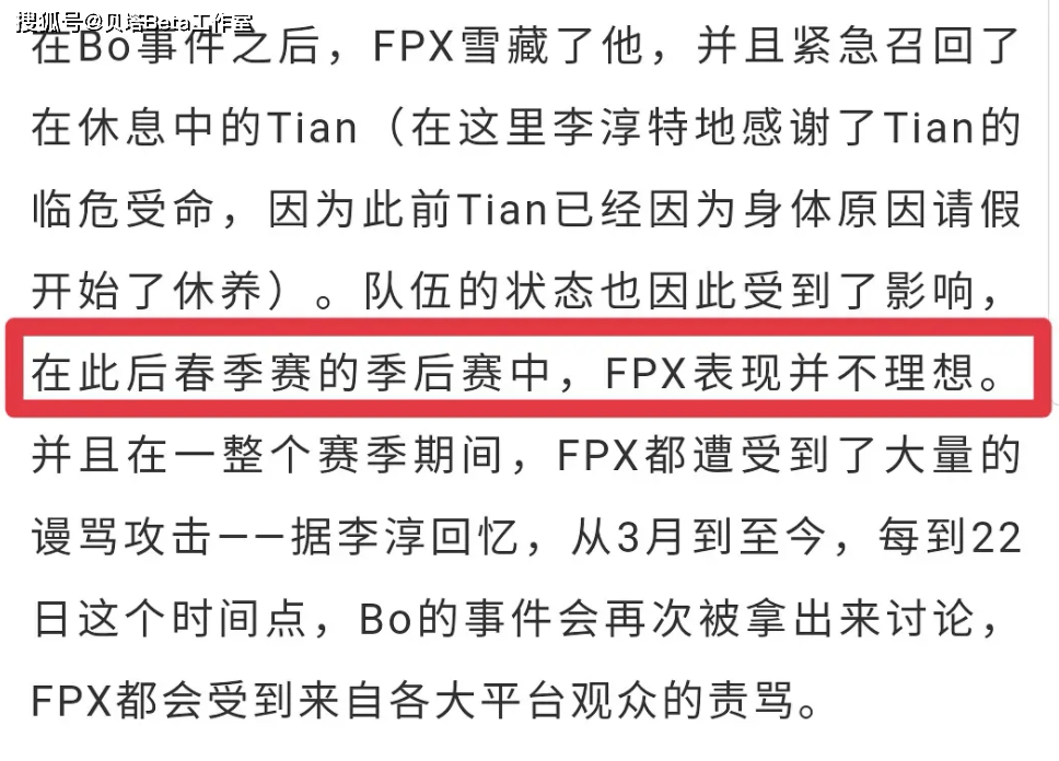 接着是提到了Bo出事后,FPX把还在休养中的小天叫了回来,但是队伍的状态受到影响,季后赛表现不佳,而且FPX遭到了大量的攻击和谩骂。