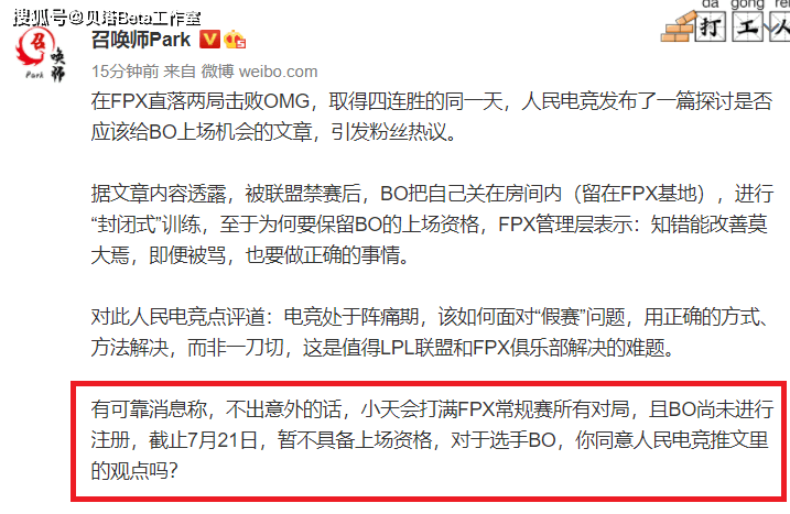 LPL夏季赛打到现在为止,争议最大的事情应该就是FPX老板李淳的微博,他发表长文表态自己支持Bo重回赛场,并且Bo回归的时间将取决于他在训练赛中的状态,也就是说Bo存在随时上场的可能。从这段微博发布以来,FPX老板李淳和官博都在每天遭受着大量的爆破,最近知名官媒“人民电竞”采访了FPX老板李淳,他再次表示绝不会放弃Bo。