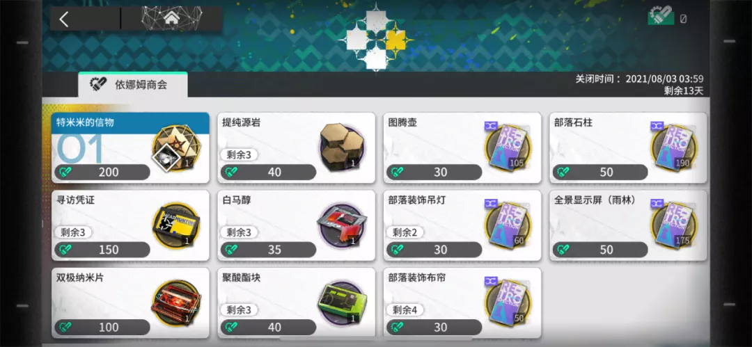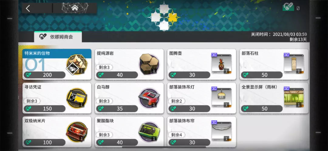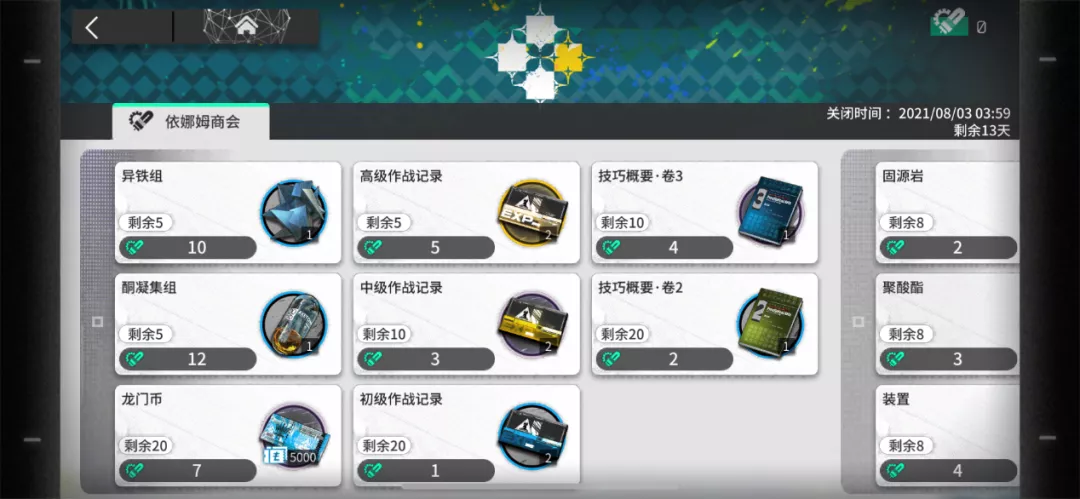 对于第二次参加活动的玩家来说,虽然复刻活动商店容量较小,但依旧非常推荐在活动中囤积素材,比起刷取会更为划算一些。双击纳米片之类的精英化素材依旧是非常推荐兑换的。干员满潜后再兑换信物可以获得高级凭证,家具全部兑换则可以获得共900的情报凭证。对于这一类素材有需求的博士可以根据自己的情况进行兑换。干员信物全部兑换共需机械零件1400个,家具全兑换共需机械零件310个。
