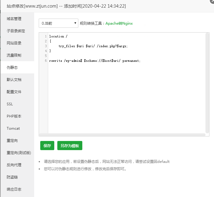不同的环境不同,也存在操作方面的问题,宝塔面板操作相对来说比较简单。 只需要进入宝塔的后台,然后找到你建立的网站,在设置—伪静态,选择wordpress,重启Nginx服务器即可。
