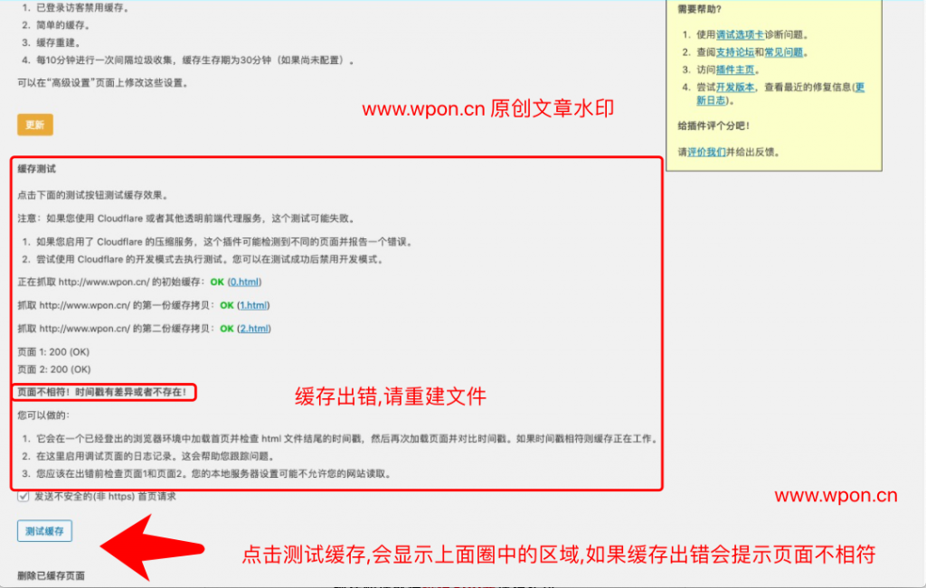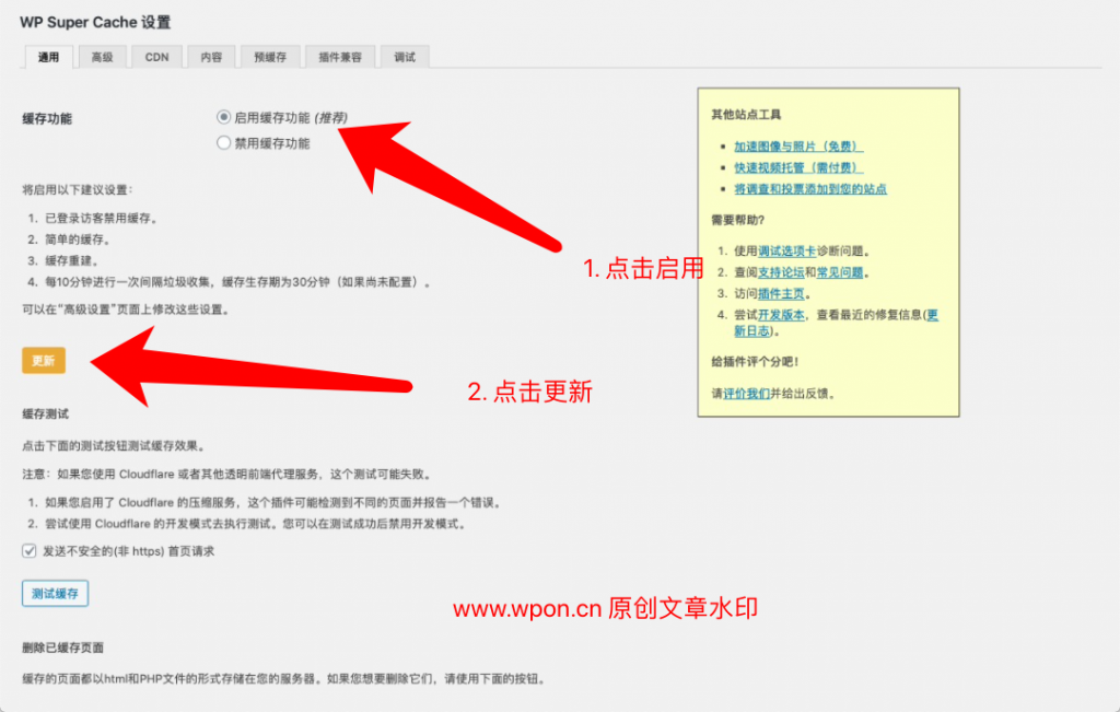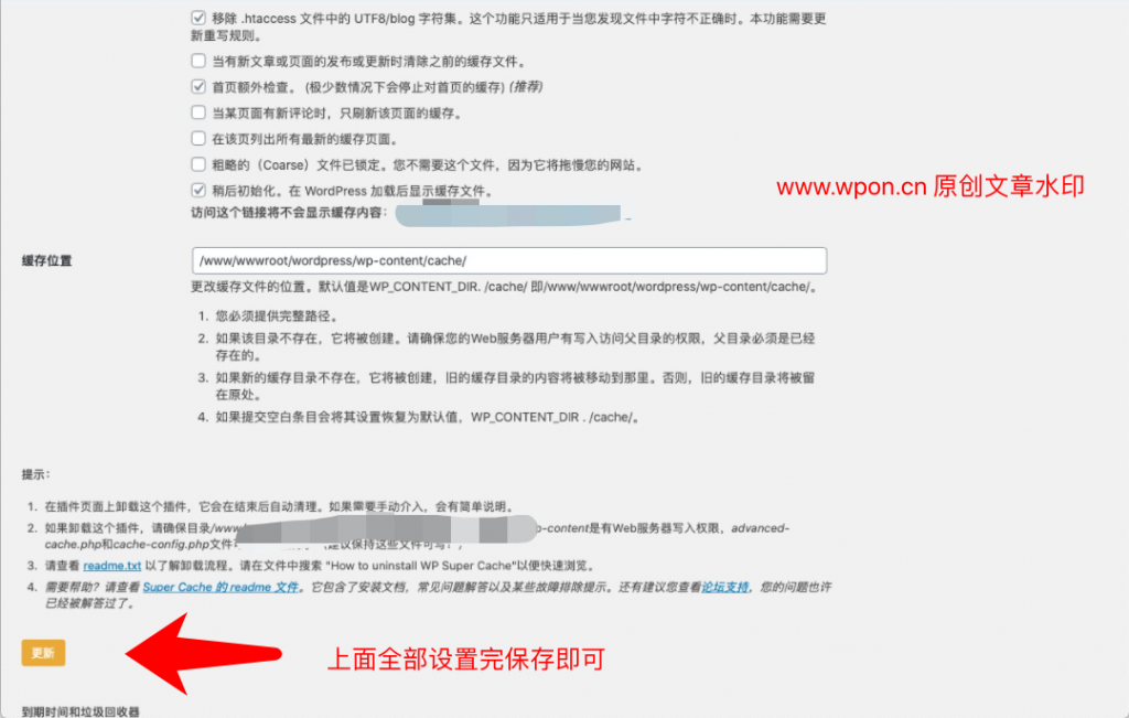 点击 更新 即可保存你的所有设置,然后来到WP-SUPER-CACHE 的设置首页中心