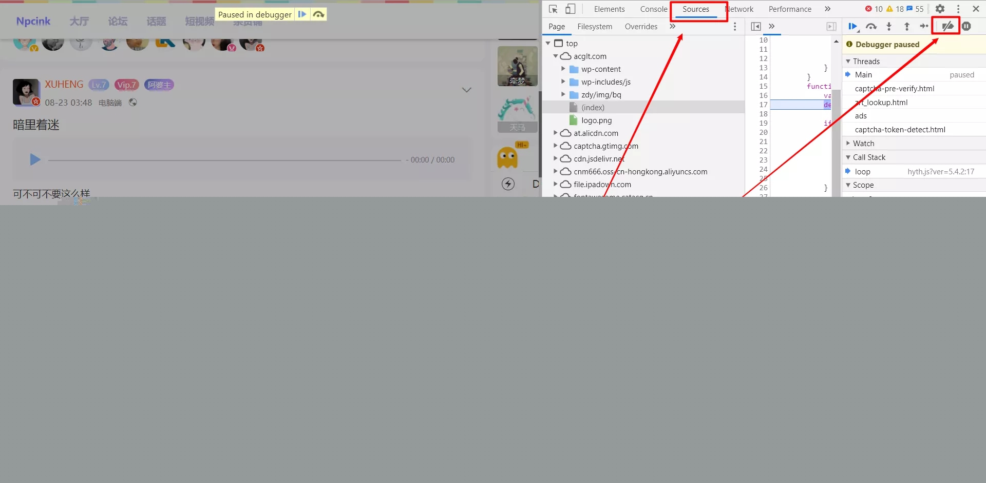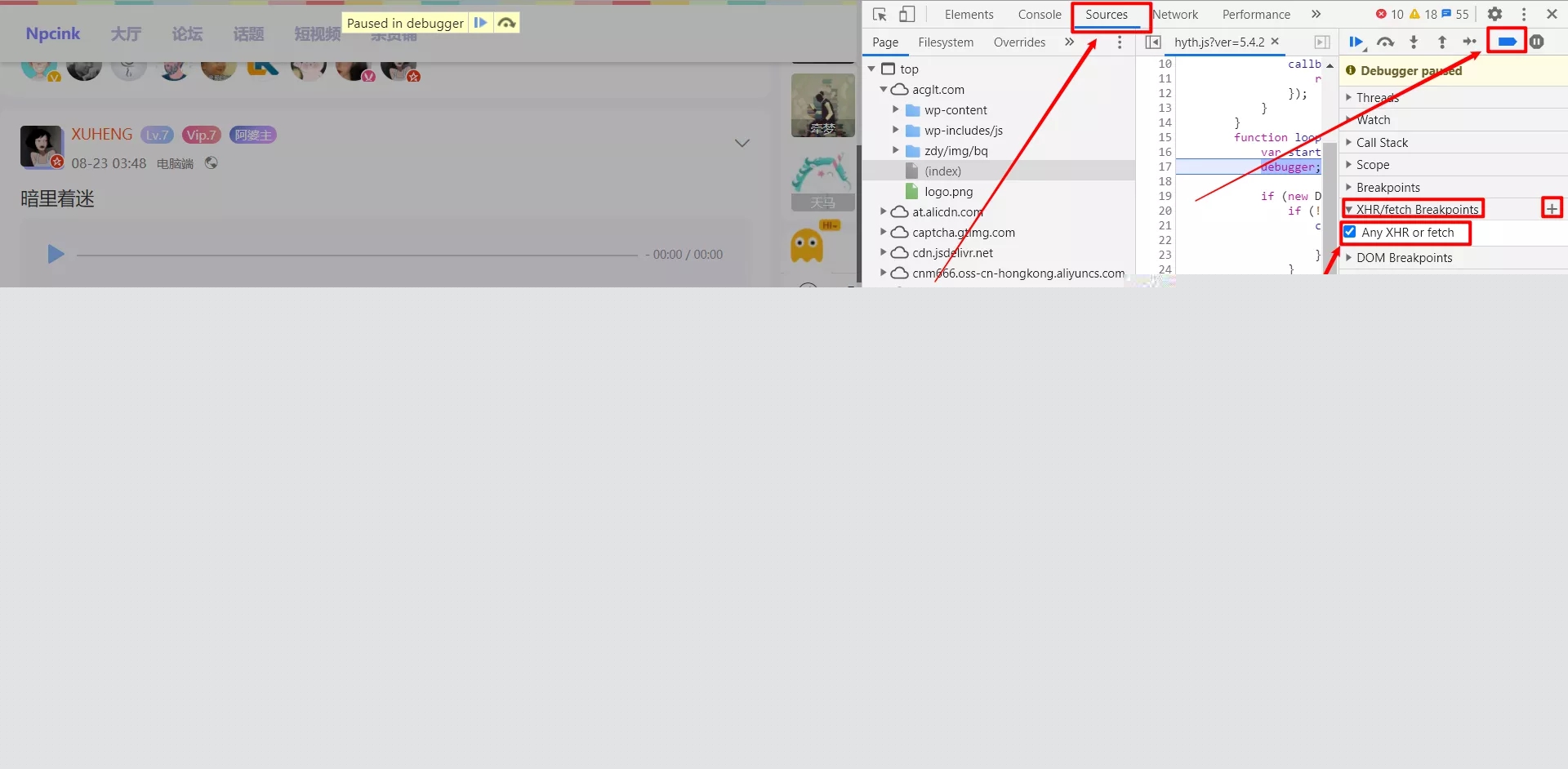 最近在个别站点F12调试网页会提示这个,于是见NPCink上有一篇教程,分享绕过浏览器F12调试网页出现的Paused in debugger的方法: