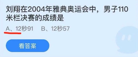解析:刘翔在雅典奥运会上的跨栏成绩是12秒91,夺得了冠军。
