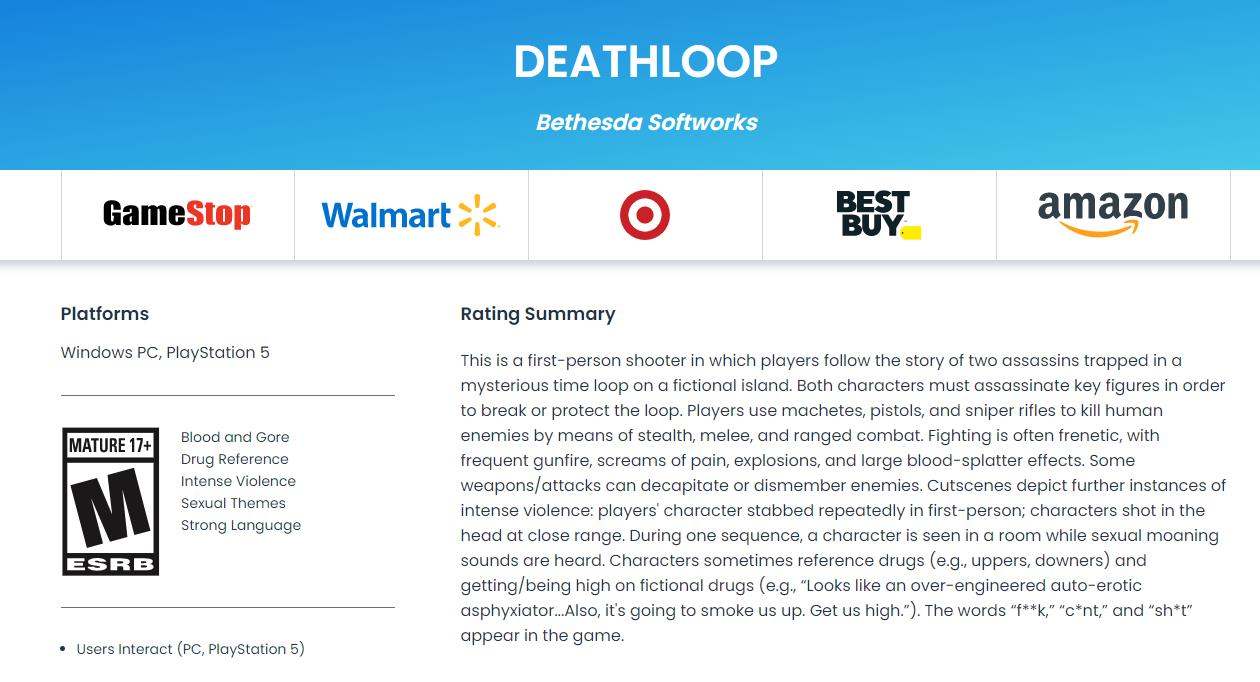 B社第一人称射击游戏《死亡循环》ESRB评级为M 该作包含大量暴力、性暗示等元素