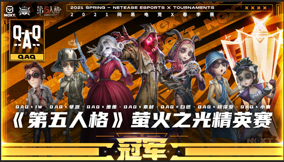网易电竞NeXT2021春季赛《第五人格》萤火之光·精英赛在7月22日迎来决赛!QAQ、ODG、TJQ和RD四支队伍一决胜负,QAQ凭借出色发挥,在各有特点的四支强队中突出重围,成为本届萤火之光精英赛的冠军!