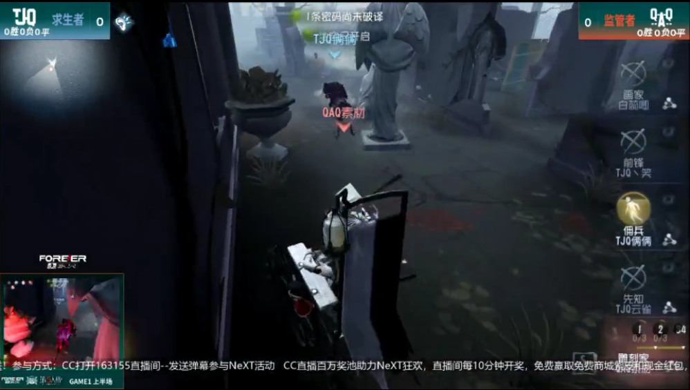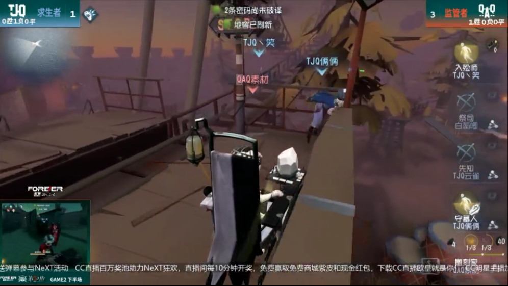 下半场,TJQ作为监管者选出26号守卫,求生者选出佣兵、先知、空军和前锋的阵容。开局监管者针对先知发动进攻,投掷连续的预判炸倒将其击倒。求生者放弃救援,快速修机,监管者第二波进攻节奏剑指佣兵,将其上绑。最后前锋救援队友,但没能及时跑开,遭到换绑放飞,求生者打出2跑,双方2:2打平。